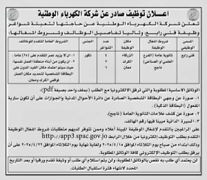 اعلان توظيف صادر عن شركة الكهرباء الوطنية