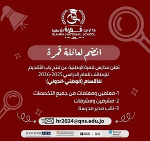 تعلن روضة و مدارس قمرة الوطنية في الأردن عن فتحها باب استقبال طلبات التوظيف / معلمين ومعلمات من جميع التخصصات