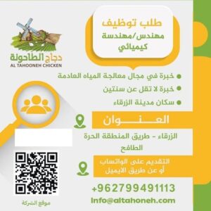 وظائف شاغرة متوفرة لدى دجاج الطاحونة برواتب ممتازه – الزرقاء وظائف القطاع الخاص في الأردنفرص عمل في يوليو 16, 2025 وظائف شاغرة متوفرة لدى دجاج الطاحونة برواتب ممتازه – الزرقاء شارك وظائف عمل شاغرة متاحة في شركة دجاج الطاحونة – الرواتب ممتازة فرصتك للانضمام إلى فريق عمل دجاج الطاحونة! نبحث عن مهندس/مهندسة كيميائي بخبرة في التعامل مع المياه المستعملة لا تقل عن سنتين، ومن سكان مدينة الزرقاء. 📍 العنوان: الزرقاء – طريق المنطقة الحرة الطافح