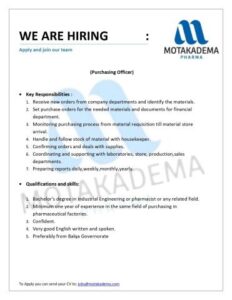تعلن شركة المتقدمة للصناعات الدوائية عن وجود فرصة عمل جديدة في قسم المشتريات، وفقًا للشروط الموجودة في المرفقات.